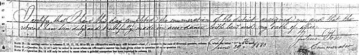 A copy of Julius' handwriting. The bottom reads, "I certify that I have this day completed the enumeration of the district assigned me, and that the returns have been duly and truthfully made in accordance with law and my oath of office." The date is June 29th, 1880.