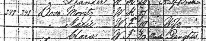 Moritz and his wife and daughter. There were many categories (not shown here) on the census including occupation , place of birth , and birthplace of father and mother (Moritz is listed as a farmer and Marie as keeping house; Moritz, Marie and Clara were all born in Texas; Moritz' father and mother were born in Prussia; Marie's parents were born in Wurtemberg and Saxony).
